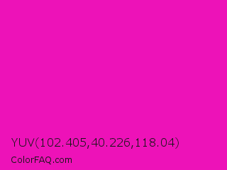 YUV 102.405,40.226,118.04 Color is a normal magenta color and the nearest color is Shocking Pink #fc0fc0. Hex code #ed12b8 and RGB value is rgb(237,18,184). In RGB color space, this color is composed of 93% red, 7% green, 72% blue, In CMYK color space, this color is composed of 0% cyan, 92% magenta, 22% yellow , 7% black , In HSL color space, this color has a hue angle of 315° , 86% saturation and 50% lightness.