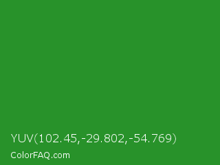 YUV 102.45,-29.802,-54.769 Color is a normal green color and the nearest color is Forest Green #228b22. Hex code #28922a and RGB value is rgb(40,146,42). In RGB color space, this color is composed of 16% red, 57% green, 16% blue, In CMYK color space, this color is composed of 73% cyan, 0% magenta, 71% yellow , 43% black , In HSL color space, this color has a hue angle of 121° , 57% saturation and 36% lightness.