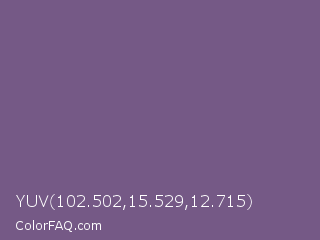 YUV 102.502,15.529,12.715 Color is a normal purple color and the nearest color is Rum #796989. Hex code #755986 and RGB value is rgb(117,89,134). In RGB color space, this color is composed of 46% red, 35% green, 53% blue, In CMYK color space, this color is composed of 13% cyan, 34% magenta, 0% yellow , 47% black , In HSL color space, this color has a hue angle of 277° , 20% saturation and 44% lightness.