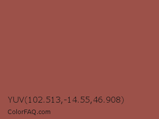 YUV 102.513,-14.55,46.908 Color is a normal red color and the nearest color is Copper Rust #944747. Hex code #9c5149 and RGB value is rgb(156,81,73). In RGB color space, this color is composed of 61% red, 32% green, 29% blue, In CMYK color space, this color is composed of 0% cyan, 48% magenta, 53% yellow , 39% black , In HSL color space, this color has a hue angle of 6° , 36% saturation and 45% lightness.