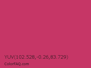 YUV 102.528,-0.26,83.729 Color is a normal rose color and the nearest color is Hibiscus #b6316c. Hex code #c63666 and RGB value is rgb(198,54,102). In RGB color space, this color is composed of 78% red, 21% green, 40% blue, In CMYK color space, this color is composed of 0% cyan, 73% magenta, 48% yellow , 22% black , In HSL color space, this color has a hue angle of 340° , 57% saturation and 49% lightness.