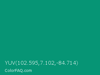YUV 102.595,7.102,-84.714 Color is a dark cyan color and the nearest color is Paolo Veronese Green #009b7d. Hex code #069575 and RGB value is rgb(6,149,117). In RGB color space, this color is composed of 2% red, 58% green, 46% blue, In CMYK color space, this color is composed of 96% cyan, 0% magenta, 21% yellow , 42% black , In HSL color space, this color has a hue angle of 167° , 92% saturation and 30% lightness.
