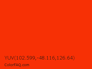 YUV 102.599,-48.116,126.64 Color is a normal red color and the nearest color is Coquelicot #ff3800. Hex code #f73005 and RGB value is rgb(247,48,5). In RGB color space, this color is composed of 97% red, 19% green, 2% blue, In CMYK color space, this color is composed of 0% cyan, 81% magenta, 98% yellow , 3% black , In HSL color space, this color has a hue angle of 11° , 96% saturation and 49% lightness.