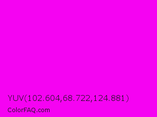 YUV 102.604,68.722,124.881 Color is a normal magenta color and the nearest color is Magenta / Fuchsia #ff00ff. Hex code #f503f2 and RGB value is rgb(245,3,242). In RGB color space, this color is composed of 96% red, 1% green, 95% blue, In CMYK color space, this color is composed of 0% cyan, 99% magenta, 1% yellow , 4% black , In HSL color space, this color has a hue angle of 301° , 98% saturation and 49% lightness.