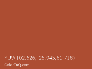 YUV 102.626,-25.945,61.718 Color is a normal red color and the nearest color is Medium Carmine #af4035. Hex code #ad4d32 and RGB value is rgb(173,77,50). In RGB color space, this color is composed of 68% red, 30% green, 20% blue, In CMYK color space, this color is composed of 0% cyan, 55% magenta, 71% yellow , 32% black , In HSL color space, this color has a hue angle of 13° , 55% saturation and 44% lightness.