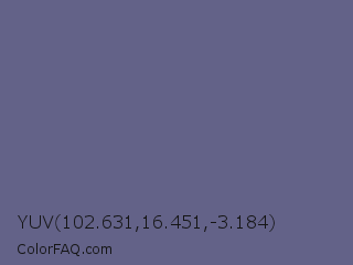 YUV 102.631,16.451,-3.184 Color is a normal indigo color and the nearest color is Dolphin #646077. Hex code #636288 and RGB value is rgb(99,98,136). In RGB color space, this color is composed of 39% red, 38% green, 53% blue, In CMYK color space, this color is composed of 27% cyan, 28% magenta, 0% yellow , 47% black , In HSL color space, this color has a hue angle of 242° , 16% saturation and 46% lightness.