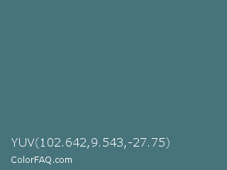 YUV 102.642,9.543,-27.75 Color is a normal cyan color and the nearest color is Faded Jade #427977. Hex code #47737a and RGB value is rgb(71,115,122). In RGB color space, this color is composed of 28% red, 45% green, 48% blue, In CMYK color space, this color is composed of 42% cyan, 6% magenta, 0% yellow , 52% black , In HSL color space, this color has a hue angle of 188° , 26% saturation and 38% lightness.