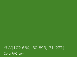 YUV 102.664,-30.893,-31.277 Color is a normal green color and the nearest color is Sap Green #507d2a. Hex code #438528 and RGB value is rgb(67,133,40). In RGB color space, this color is composed of 26% red, 52% green, 16% blue, In CMYK color space, this color is composed of 50% cyan, 0% magenta, 70% yellow , 48% black , In HSL color space, this color has a hue angle of 103° , 54% saturation and 34% lightness.