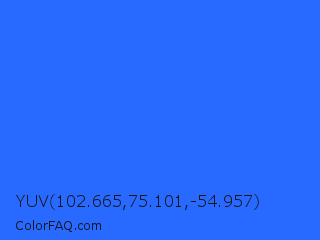 YUV 102.665,75.101,-54.957 Color is a normal blue color and the nearest color is Blue Crayola #1f75fe. Hex code #2869ff and RGB value is rgb(40,105,255). In RGB color space, this color is composed of 16% red, 41% green, 100% blue, In CMYK color space, this color is composed of 84% cyan, 59% magenta, 0% yellow , 0% black , In HSL color space, this color has a hue angle of 222° , 100% saturation and 58% lightness.