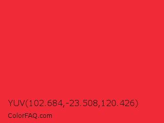 YUV 102.684,-23.508,120.426 Color is a normal red color and the nearest color is Imperial Red #ed2939. Hex code #f02a37 and RGB value is rgb(240,42,55). In RGB color space, this color is composed of 94% red, 16% green, 22% blue, In CMYK color space, this color is composed of 0% cyan, 83% magenta, 77% yellow , 6% black , In HSL color space, this color has a hue angle of 356° , 87% saturation and 55% lightness.