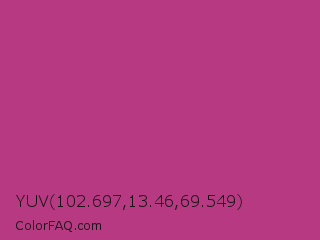 YUV 102.697,13.46,69.549 Color is a normal magenta color and the nearest color is Medium Red Violet #bb3385. Hex code #b63982 and RGB value is rgb(182,57,130). In RGB color space, this color is composed of 71% red, 22% green, 51% blue, In CMYK color space, this color is composed of 0% cyan, 69% magenta, 29% yellow , 29% black , In HSL color space, this color has a hue angle of 325° , 52% saturation and 47% lightness.