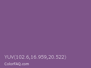 YUV 102.6,16.959,20.522 Color is a normal purple color and the nearest color is Chinese Violet #856088. Hex code #7e5489 and RGB value is rgb(126,84,137). In RGB color space, this color is composed of 49% red, 33% green, 54% blue, In CMYK color space, this color is composed of 8% cyan, 39% magenta, 0% yellow , 46% black , In HSL color space, this color has a hue angle of 288° , 24% saturation and 43% lightness.