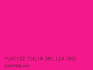 YUV 102.716,18.381,124.783 Color is a normal rose color and the nearest color is Fluorescent Pink #ff1493. Hex code #f5178c and RGB value is rgb(245,23,140). In RGB color space, this color is composed of 96% red, 9% green, 55% blue, In CMYK color space, this color is composed of 0% cyan, 91% magenta, 43% yellow , 4% black , In HSL color space, this color has a hue angle of 328° , 92% saturation and 53% lightness.