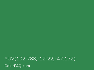YUV 102.788,-12.22,-47.172 Color is a normal green color and the nearest color is Sea Green #2e8b57. Hex code #31874e and RGB value is rgb(49,135,78). In RGB color space, this color is composed of 19% red, 53% green, 31% blue, In CMYK color space, this color is composed of 64% cyan, 0% magenta, 42% yellow , 47% black , In HSL color space, this color has a hue angle of 140° , 47% saturation and 36% lightness.
