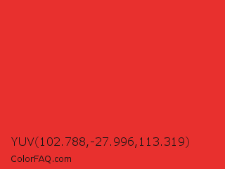 YUV 102.788,-27.996,113.319 Color is a normal red color and the nearest color is Permanent Geranium Lake #e12c2c. Hex code #e8302e and RGB value is rgb(232,48,46). In RGB color space, this color is composed of 91% red, 19% green, 18% blue, In CMYK color space, this color is composed of 0% cyan, 79% magenta, 80% yellow , 9% black , In HSL color space, this color has a hue angle of 1° , 80% saturation and 55% lightness.