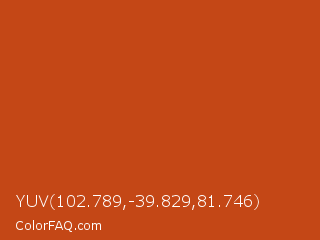 YUV 102.789,-39.829,81.746 Color is a normal orange color and the nearest color is Tia Maria #c1440e. Hex code #c44716 and RGB value is rgb(196,71,22). In RGB color space, this color is composed of 77% red, 28% green, 9% blue, In CMYK color space, this color is composed of 0% cyan, 64% magenta, 89% yellow , 23% black , In HSL color space, this color has a hue angle of 17° , 80% saturation and 43% lightness.