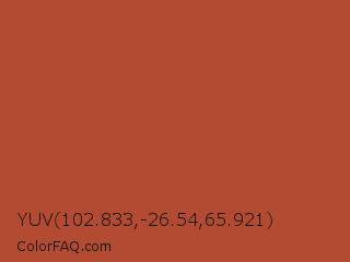 YUV 102.833,-26.54,65.921 Color is a normal red color and the nearest color is Medium Carmine #af4035. Hex code #b24b31 and RGB value is rgb(178,75,49). In RGB color space, this color is composed of 70% red, 29% green, 19% blue, In CMYK color space, this color is composed of 0% cyan, 58% magenta, 72% yellow , 30% black , In HSL color space, this color has a hue angle of 12° , 57% saturation and 45% lightness.