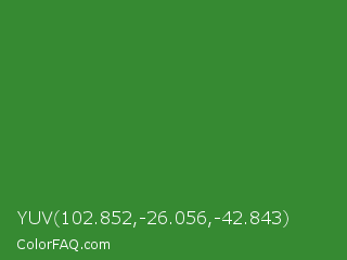 YUV 102.852,-26.056,-42.843 Color is a normal green color and the nearest color is Forest Green #228b22. Hex code #368a32 and RGB value is rgb(54,138,50). In RGB color space, this color is composed of 21% red, 54% green, 20% blue, In CMYK color space, this color is composed of 61% cyan, 0% magenta, 64% yellow , 46% black , In HSL color space, this color has a hue angle of 117° , 47% saturation and 37% lightness.