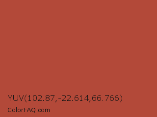 YUV 102.87,-22.614,66.766 Color is a normal red color and the nearest color is Medium Carmine #af4035. Hex code #b34939 and RGB value is rgb(179,73,57). In RGB color space, this color is composed of 70% red, 29% green, 22% blue, In CMYK color space, this color is composed of 0% cyan, 59% magenta, 68% yellow , 30% black , In HSL color space, this color has a hue angle of 8° , 52% saturation and 46% lightness.