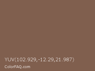 YUV 102.929,-12.29,21.987 Color is a normal orange color and the nearest color is Roman Coffee #795d4c. Hex code #805f4e and RGB value is rgb(128,95,78). In RGB color space, this color is composed of 50% red, 37% green, 31% blue, In CMYK color space, this color is composed of 0% cyan, 26% magenta, 39% yellow , 50% black , In HSL color space, this color has a hue angle of 20° , 24% saturation and 40% lightness.