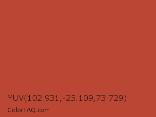 YUV 102.931,-25.109,73.729 Color is a normal red color and the nearest color is Mojo #c04737. Hex code #bb4634 and RGB value is rgb(187,70,52). In RGB color space, this color is composed of 73% red, 27% green, 20% blue, In CMYK color space, this color is composed of 0% cyan, 63% magenta, 72% yellow , 27% black , In HSL color space, this color has a hue angle of 8° , 56% saturation and 47% lightness.
