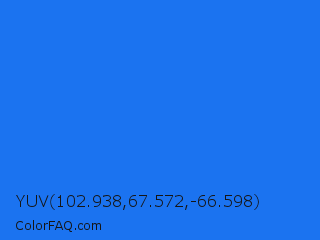 YUV 102.938,67.572,-66.598 Color is a normal blue color and the nearest color is Blue Crayola #1f75fe. Hex code #1b73f0 and RGB value is rgb(27,115,240). In RGB color space, this color is composed of 11% red, 45% green, 94% blue, In CMYK color space, this color is composed of 89% cyan, 52% magenta, 0% yellow , 6% black , In HSL color space, this color has a hue angle of 215° , 88% saturation and 52% lightness.