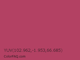 YUV 102.962,-1.953,66.685 Color is a normal rose color and the nearest color is Hippie Pink #ae4560. Hex code #b34163 and RGB value is rgb(179,65,99). In RGB color space, this color is composed of 70% red, 25% green, 39% blue, In CMYK color space, this color is composed of 0% cyan, 64% magenta, 45% yellow , 30% black , In HSL color space, this color has a hue angle of 342° , 47% saturation and 48% lightness.
