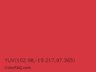 YUV 102.98,-19.217,97.365 Color is a normal red color and the nearest color is Jasper #d73b3e. Hex code #d63640 and RGB value is rgb(214,54,64). In RGB color space, this color is composed of 84% red, 21% green, 25% blue, In CMYK color space, this color is composed of 0% cyan, 75% magenta, 70% yellow , 16% black , In HSL color space, this color has a hue angle of 356° , 66% saturation and 53% lightness.
