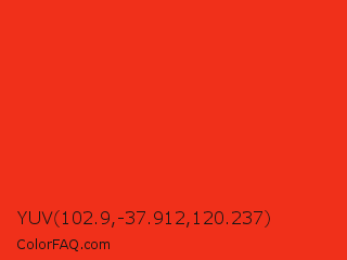 YUV 102.9,-37.912,120.237 Color is a normal red color and the nearest color is Red RYB #fe2712. Hex code #f0301a and RGB value is rgb(240,48,26). In RGB color space, this color is composed of 94% red, 19% green, 10% blue, In CMYK color space, this color is composed of 0% cyan, 80% magenta, 89% yellow , 6% black , In HSL color space, this color has a hue angle of 6° , 88% saturation and 52% lightness.