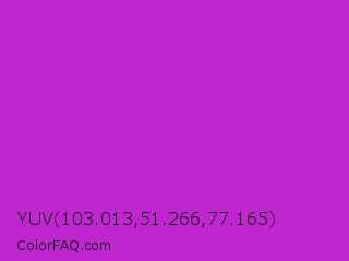 YUV 103.013,51.266,77.165 Color is a normal magenta color and the nearest color is Steel Pink #cc33cc. Hex code #bf26cf and RGB value is rgb(191,38,207). In RGB color space, this color is composed of 75% red, 15% green, 81% blue, In CMYK color space, this color is composed of 8% cyan, 82% magenta, 0% yellow , 19% black , In HSL color space, this color has a hue angle of 294° , 69% saturation and 48% lightness.