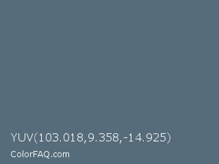 YUV 103.018,9.358,-14.925 Color is a normal blue color and the nearest color is Paynes Grey #536878. Hex code #566c7a and RGB value is rgb(86,108,122). In RGB color space, this color is composed of 34% red, 42% green, 48% blue, In CMYK color space, this color is composed of 30% cyan, 11% magenta, 0% yellow , 52% black , In HSL color space, this color has a hue angle of 203° , 17% saturation and 41% lightness.