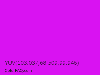 YUV 103.037,68.509,99.946 Color is a normal magenta color and the nearest color is Phlox #df00ff. Hex code #d912f2 and RGB value is rgb(217,18,242). In RGB color space, this color is composed of 85% red, 7% green, 95% blue, In CMYK color space, this color is composed of 10% cyan, 93% magenta, 0% yellow , 5% black , In HSL color space, this color has a hue angle of 293° , 90% saturation and 51% lightness.