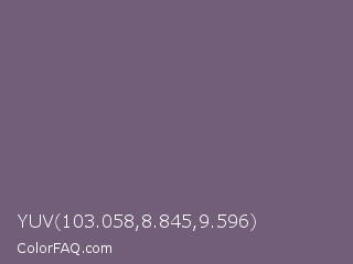 YUV 103.058,8.845,9.596 Color is a normal purple color and the nearest color is Old Lavender #796878. Hex code #725e79 and RGB value is rgb(114,94,121). In RGB color space, this color is composed of 45% red, 37% green, 47% blue, In CMYK color space, this color is composed of 6% cyan, 22% magenta, 0% yellow , 53% black , In HSL color space, this color has a hue angle of 284° , 13% saturation and 42% lightness.