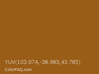 YUV 103.074,-38.983,43.785 Color is a normal orange color and the nearest color is Hawaiian Tan #9d5616. Hex code #995d18 and RGB value is rgb(153,93,24). In RGB color space, this color is composed of 60% red, 36% green, 9% blue, In CMYK color space, this color is composed of 0% cyan, 39% magenta, 84% yellow , 40% black , In HSL color space, this color has a hue angle of 32° , 73% saturation and 35% lightness.