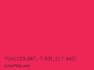 YUV 103.087,-7.931,117.442 Color is a normal red color and the nearest color is Red Crayola #ee204d. Hex code #ed2657 and RGB value is rgb(237,38,87). In RGB color space, this color is composed of 93% red, 15% green, 34% blue, In CMYK color space, this color is composed of 0% cyan, 84% magenta, 63% yellow , 7% black , In HSL color space, this color has a hue angle of 345° , 85% saturation and 54% lightness.