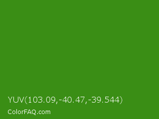 YUV 103.09,-40.47,-39.544 Color is a normal green color and the nearest color is La Palma #368716. Hex code #3a8e15 and RGB value is rgb(58,142,21). In RGB color space, this color is composed of 23% red, 56% green, 8% blue, In CMYK color space, this color is composed of 59% cyan, 0% magenta, 85% yellow , 44% black , In HSL color space, this color has a hue angle of 102° , 74% saturation and 32% lightness.