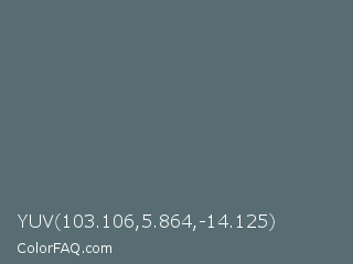 YUV 103.106,5.864,-14.125 Color is a normal cyan color and the nearest color is Cadet #536872. Hex code #576d73 and RGB value is rgb(87,109,115). In RGB color space, this color is composed of 34% red, 43% green, 45% blue, In CMYK color space, this color is composed of 24% cyan, 5% magenta, 0% yellow , 55% black , In HSL color space, this color has a hue angle of 193° , 14% saturation and 40% lightness.