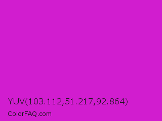 YUV 103.112,51.217,92.864 Color is a normal magenta color and the nearest color is Steel Pink #cc33cc. Hex code #d11dcf and RGB value is rgb(209,29,207). In RGB color space, this color is composed of 82% red, 11% green, 81% blue, In CMYK color space, this color is composed of 0% cyan, 86% magenta, 1% yellow , 18% black , In HSL color space, this color has a hue angle of 301° , 76% saturation and 47% lightness.