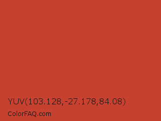 YUV 103.128,-27.178,84.08 Color is a normal red color and the nearest color is Mojo #c04737. Hex code #c74130 and RGB value is rgb(199,65,48). In RGB color space, this color is composed of 78% red, 25% green, 19% blue, In CMYK color space, this color is composed of 0% cyan, 67% magenta, 76% yellow , 22% black , In HSL color space, this color has a hue angle of 7° , 61% saturation and 48% lightness.