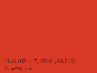YUV 103.147,-32.61,99.849 Color is a normal red color and the nearest color is Vermilion #d9381e. Hex code #d93a25 and RGB value is rgb(217,58,37). In RGB color space, this color is composed of 85% red, 23% green, 15% blue, In CMYK color space, this color is composed of 0% cyan, 73% magenta, 83% yellow , 15% black , In HSL color space, this color has a hue angle of 7° , 71% saturation and 50% lightness.