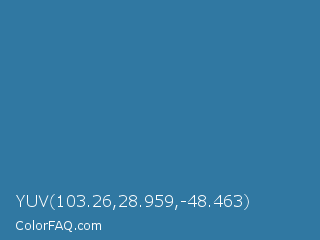 YUV 103.26,28.959,-48.463 Color is a normal blue color and the nearest color is Astral #327da0. Hex code #3078a2 and RGB value is rgb(48,120,162). In RGB color space, this color is composed of 19% red, 47% green, 64% blue, In CMYK color space, this color is composed of 70% cyan, 26% magenta, 0% yellow , 36% black , In HSL color space, this color has a hue angle of 202° , 54% saturation and 41% lightness.