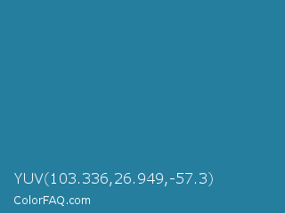 YUV 103.336,26.949,-57.3 Color is a normal blue color and the nearest color is Jelly Bean #297b9a. Hex code #267e9e and RGB value is rgb(38,126,158). In RGB color space, this color is composed of 15% red, 49% green, 62% blue, In CMYK color space, this color is composed of 76% cyan, 20% magenta, 0% yellow , 38% black , In HSL color space, this color has a hue angle of 196° , 61% saturation and 38% lightness.