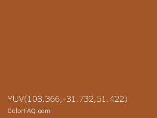 YUV 103.366,-31.732,51.422 Color is a normal orange color and the nearest color is Paarl #a65529. Hex code #a25627 and RGB value is rgb(162,86,39). In RGB color space, this color is composed of 64% red, 34% green, 15% blue, In CMYK color space, this color is composed of 0% cyan, 47% magenta, 76% yellow , 36% black , In HSL color space, this color has a hue angle of 23° , 61% saturation and 39% lightness.