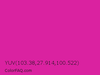 YUV 103.38,27.914,100.522 Color is a normal magenta color and the nearest color is Barbie Pink #e0218a. Hex code #da22a0 and RGB value is rgb(218,34,160). In RGB color space, this color is composed of 85% red, 13% green, 63% blue, In CMYK color space, this color is composed of 0% cyan, 84% magenta, 27% yellow , 15% black , In HSL color space, this color has a hue angle of 319° , 73% saturation and 49% lightness.