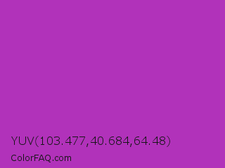 YUV 103.477,40.684,64.48 Color is a normal magenta color and the nearest color is Byzantine #bd33a4. Hex code #b132ba and RGB value is rgb(177,50,186). In RGB color space, this color is composed of 69% red, 20% green, 73% blue, In CMYK color space, this color is composed of 5% cyan, 73% magenta, 0% yellow , 27% black , In HSL color space, this color has a hue angle of 296° , 58% saturation and 46% lightness.