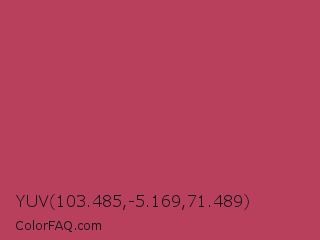 YUV 103.485,-5.169,71.489 Color is a normal red color and the nearest color is Hippie Pink #ae4560. Hex code #b9405d and RGB value is rgb(185,64,93). In RGB color space, this color is composed of 73% red, 25% green, 36% blue, In CMYK color space, this color is composed of 0% cyan, 65% magenta, 50% yellow , 27% black , In HSL color space, this color has a hue angle of 346° , 49% saturation and 49% lightness.