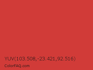 YUV 103.508,-23.421,92.516 Color is a normal red color and the nearest color is Jasper #d73b3e. Hex code #d13b38 and RGB value is rgb(209,59,56). In RGB color space, this color is composed of 82% red, 23% green, 22% blue, In CMYK color space, this color is composed of 0% cyan, 72% magenta, 73% yellow , 18% black , In HSL color space, this color has a hue angle of 1° , 62% saturation and 52% lightness.