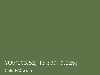 YUV 103.52,-15.539,-9.226 Color is a normal green color and the nearest color is Dingley #5d7747. Hex code #5d7348 and RGB value is rgb(93,115,72). In RGB color space, this color is composed of 36% red, 45% green, 28% blue, In CMYK color space, this color is composed of 19% cyan, 0% magenta, 37% yellow , 55% black , In HSL color space, this color has a hue angle of 91° , 23% saturation and 37% lightness.