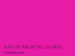 YUV 103.543,30.791,110.903 Color is a normal magenta color and the nearest color is Frostbite #e936a7. Hex code #e61ba6 and RGB value is rgb(230,27,166). In RGB color space, this color is composed of 90% red, 11% green, 65% blue, In CMYK color space, this color is composed of 0% cyan, 88% magenta, 28% yellow , 10% black , In HSL color space, this color has a hue angle of 319° , 80% saturation and 50% lightness.