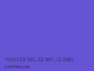 YUV 103.561,52.967,-2.246 Color is a normal indigo color and the nearest color is Slate Blue #6a5acd. Hex code #6554d3 and RGB value is rgb(101,84,211). In RGB color space, this color is composed of 40% red, 33% green, 83% blue, In CMYK color space, this color is composed of 52% cyan, 60% magenta, 0% yellow , 17% black , In HSL color space, this color has a hue angle of 248° , 59% saturation and 58% lightness.